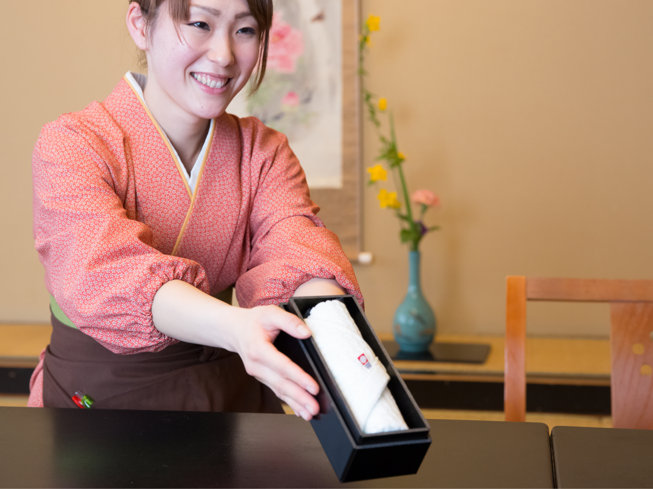 お客様のもとへ:大切なお客様をお迎えするシーンで、最高のおもてなしを形にした真心織。JAPANブランドの最高峰今治タオルブランドの素材と、職人により一本一本